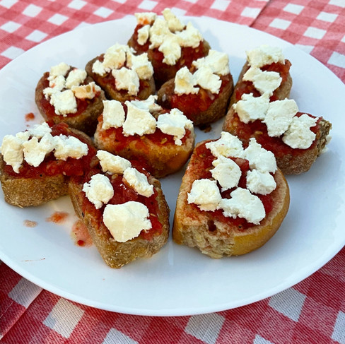 After the Stuffed Vegetables cooked for an hour and a half, we sat down at a communal dinner table to enjoy our Cretan feast. We started with the bruschetta like Dakos, that use Barley Rusks as the base and creamy fresh Myzithra topping the tomato mixture. Our other starter was the crispy Kalitsounia (cheese pies). I dipped my Kalitsounia in the Tzatziki Sauce.